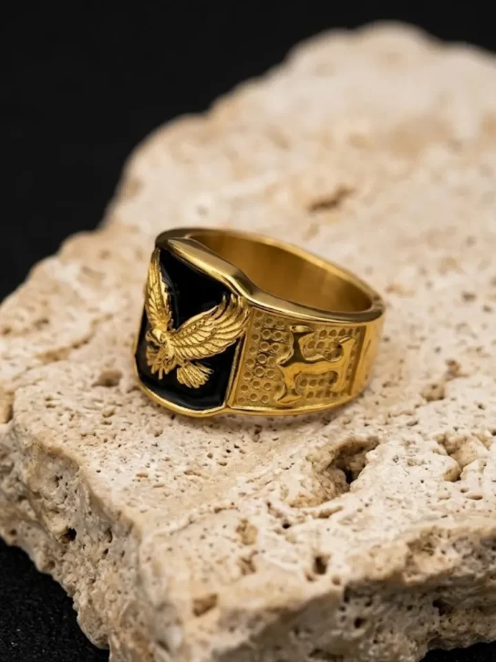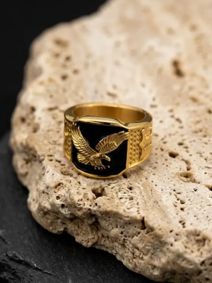 Anillo masculino con diseño imponente de águila sobre fondo negro que aporta un estilo fuerte y distintivo inspirado en la estética urbana y moderna. Fabricado en acero inoxidable 316 con enchape en oro mediante tecnología PVD, lo que garantiza alta resistencia al desgaste, al agua y al deslustre. Su diseño sólido y llamativo lo convierte en una pieza ideal para complementar looks streetwear, casuales o estilos audaces.